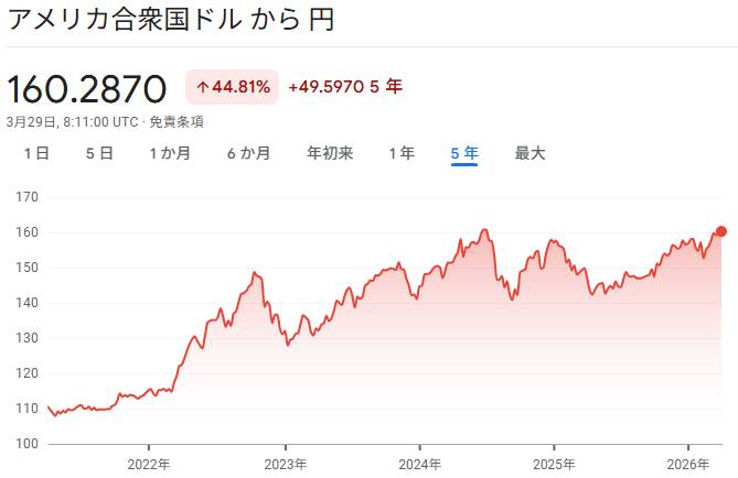 この5年はずーと円安!日本と米国の国力を考えれば最終的にどちらが強い!世界の基軸通貨であり軍事力の差は大きい。。。